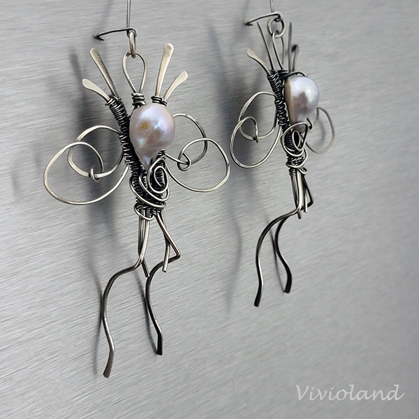 Kolczyki wykonane w całości ręcznie technikami: wire-wrapping, polegającą na pracochłonnym łączeniu za pomocą precyzyjnego owijania różnej grubości drutów srebrnych oraz łączenia ich z minerałami (w tym przypadku jest to perła)