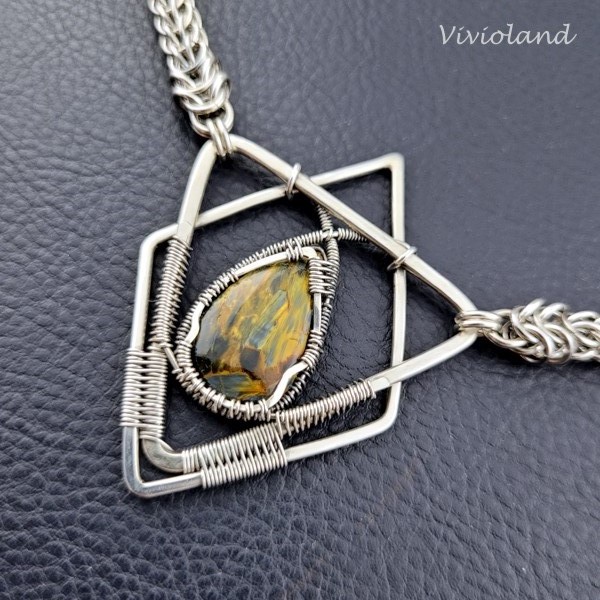 Wykonany w całości ręcznie metodą wire-wrapping, polegającą na pracochłonnym łączeniu za pomocą precyzyjnego owijania różnej grubości drutów srebrnych, a następnie łączeniu ich z kamieniami naturalnymi (w tym przypadku jest to Petersit).
