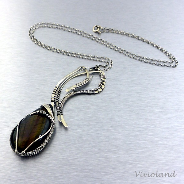 Wykonany w całości ręcznie metodą wire-wrapping, polegającą na pracochłonnym łączeniu za pomocą precyzyjnego owijania różnej grubości drutów srebrnych, a następnie łączeniu ich z kamieniami naturalnymi (w tym przypadku jest to labradoryt). Srebro jest oksydowane, oraz powierzchniowo polerowane dla podkreślenia finezji zwojów.