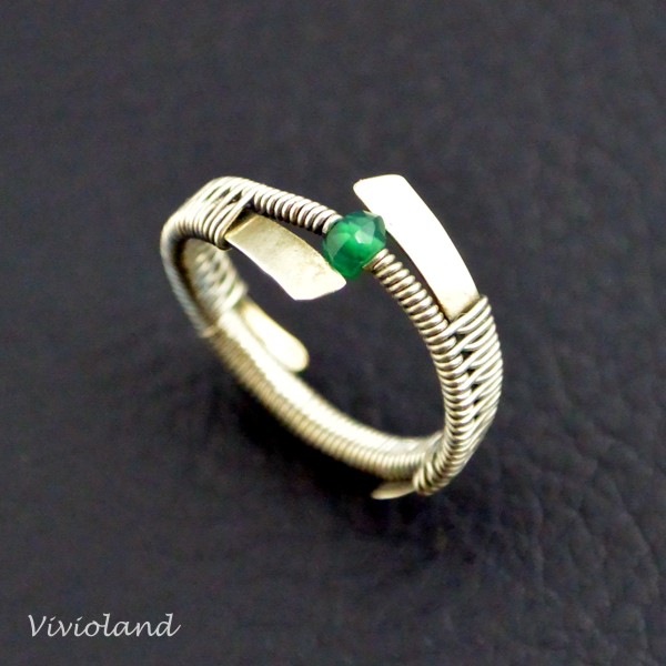 Wykonany w całości ręcznie metodą wire-wrapping, polegającą na pracochłonnym łączeniu za pomocą precyzyjnego owijania różnej grubości drutów srebrnych, a następnie łączeniu ich z kamieniami naturalnymi (w tym przypadku jest to onyks zielony). Srebro jest oksydowane, oraz powierzchniowo polerowane dla podkreślenia finezji zwojów.
