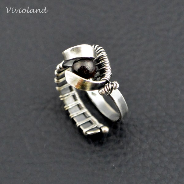 Wykonany w całości ręcznie metodą wire-wrapping, polegającą na pracochłonnym łączeniu za pomocą precyzyjnego owijania różnej grubości drutów srebrnych, a następnie łączeniu ich z kamieniami naturalnymi (w tym przypadku jest to granat). Srebro jest oksydowane, oraz powierzchniowo polerowane dla podkreślenia finezji zwojów.